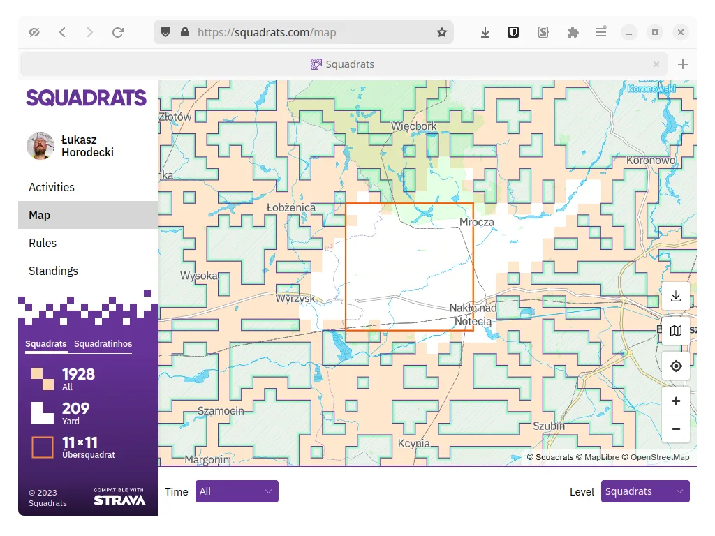 Do rozpoczęcia zabawy potrzebujemy założenia konta w serwisie i połączenia go ze Stravą (niestety obecnie Squadrats nie obsługują innych serwisów). Potem trzeba trochę poczekać, aż nasze dotychczasowe aktywności zostaną przemielone. U mnie zajęło to 18 dni, ale warto było czekać. Po połączeniu każda następna wrzucona na Stravę jazda pojawia się w Squadrats automatycznie.