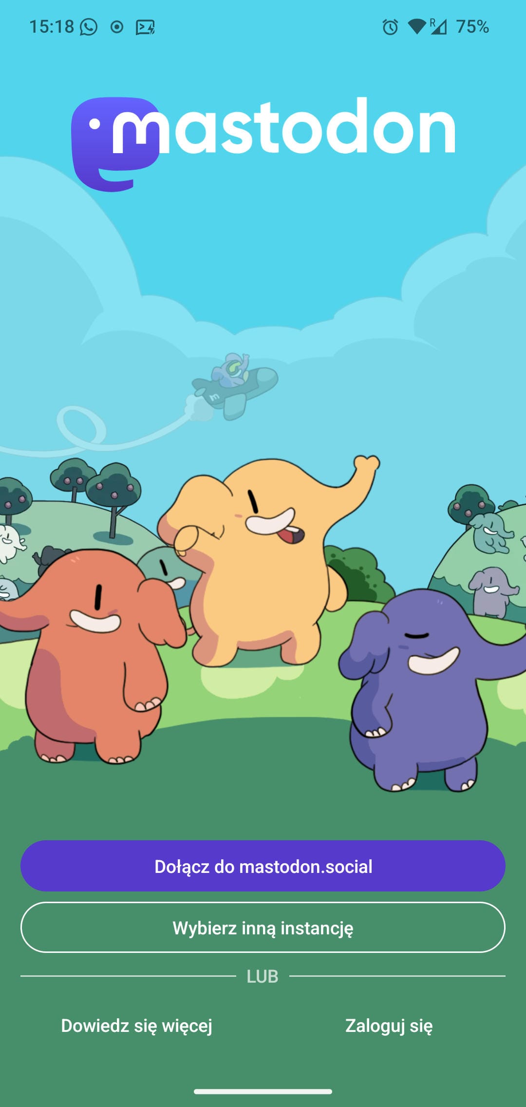 Wypada zacząć od oficjalnej aplikacji Mastodona. Jej największą zaletą jest przyjazny ekran powitalny, wprowadzający początkujących w fediświecie. Możemy dowiedzieć się, czym jest serwer, założyć nowe konto lub zalogować się na istniejące.