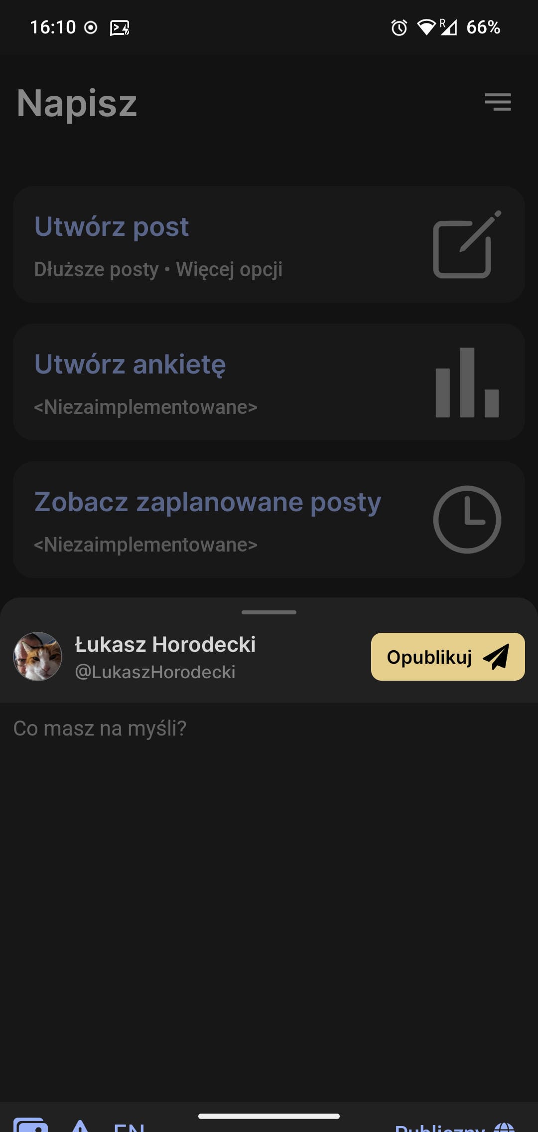 Aplikacja obsługuje wszystkie podstawowe możliwości udostępniane przez platformę, poza takimi jak planowanie publikacji i zapisywanie szkiców. Nie znalazłem też dostępu do globalnej osi czasu.