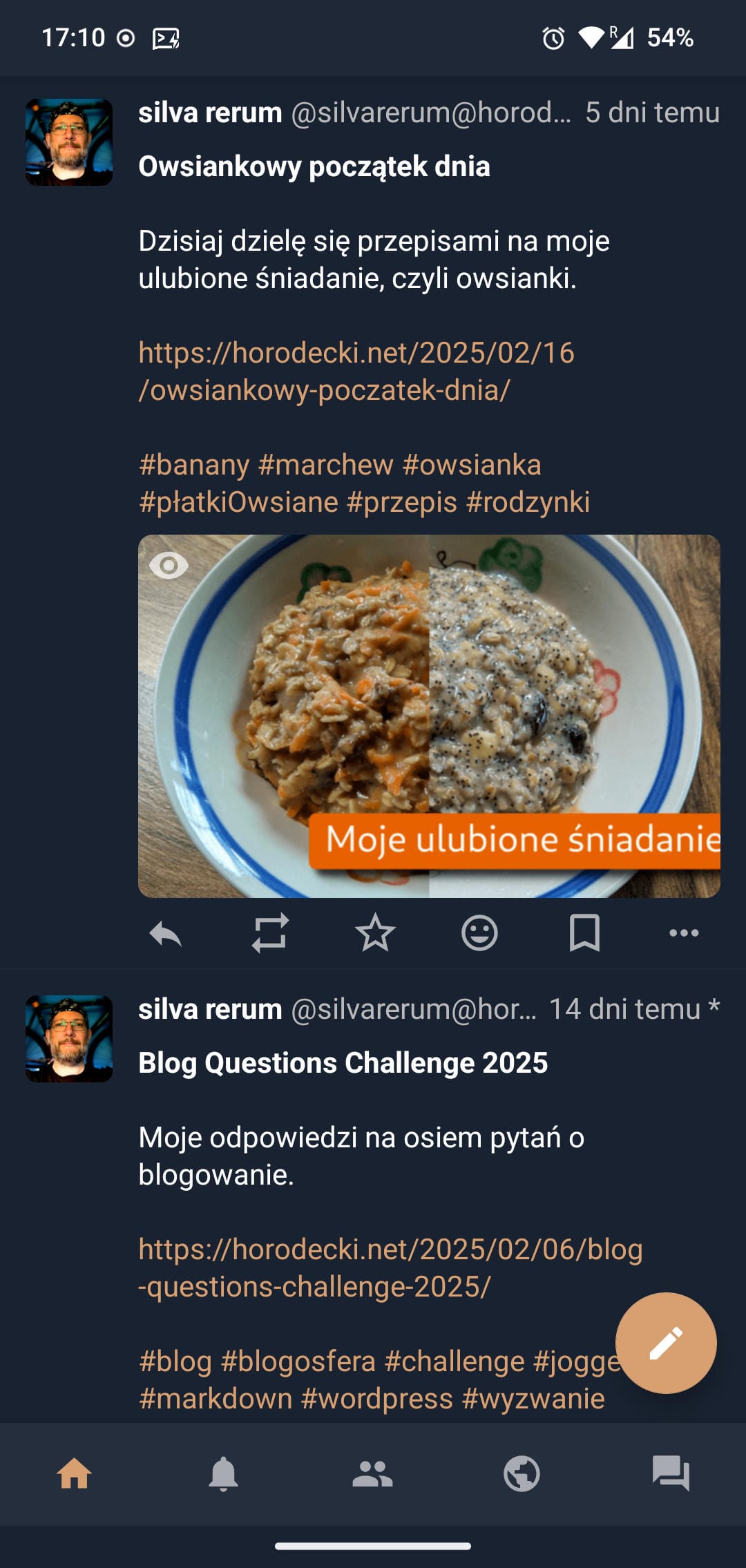 Poza tym oczywiście mamy dostęp do zwykłych osi Mastodona (obserwowanych, lokalnej oraz globalnej) i większości możliwości platformy, w tym edycji profilu.