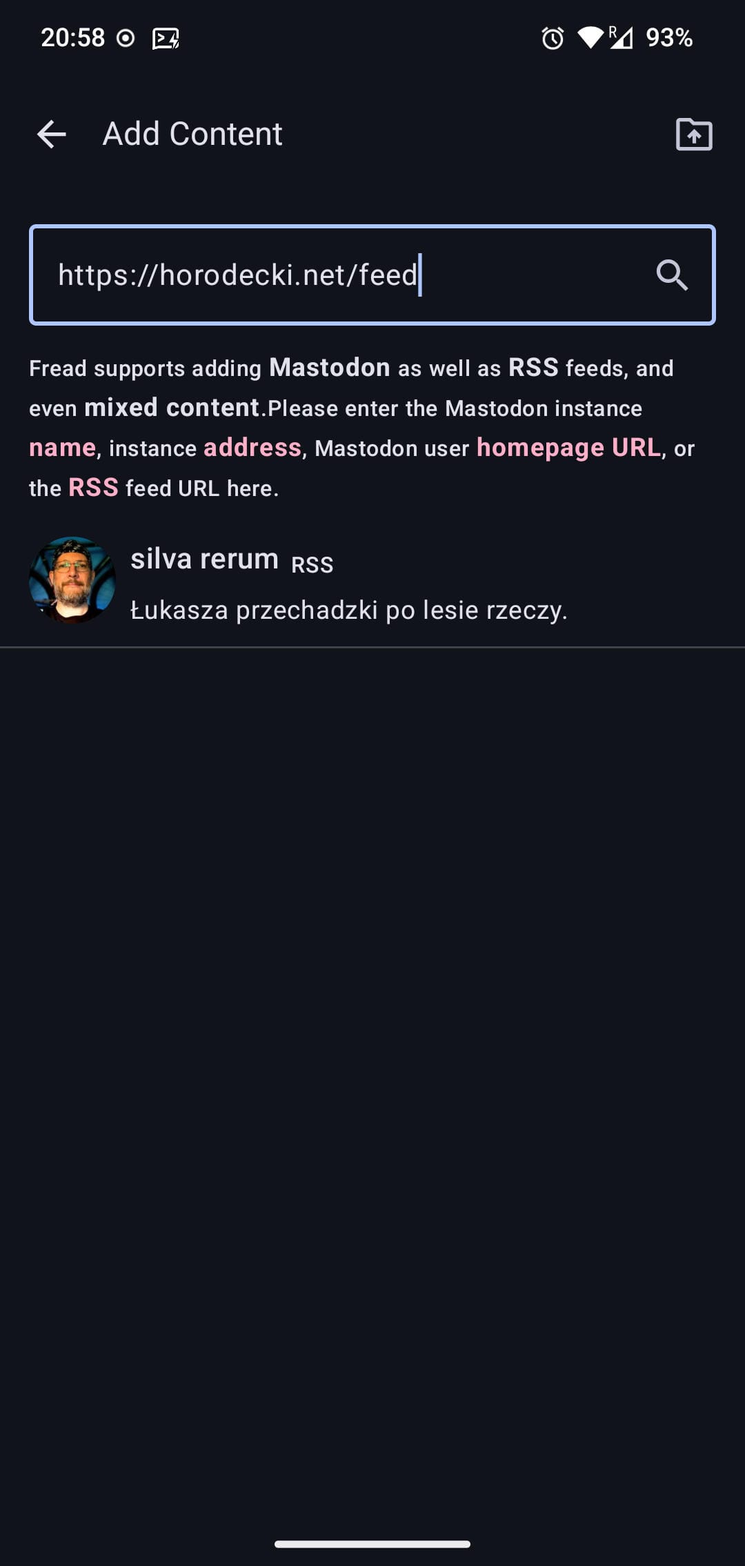 Wyróżniającą cechą Fread jest ciekawy pomysł na spięcie klienta fedi i czytnika RSS w jednej aplikacji. Możemy tu dodać kilka kont Mastodona, a obok nich kanały poukładane w foldery. Można nawet zaimportować plik OPML ze źródłami.