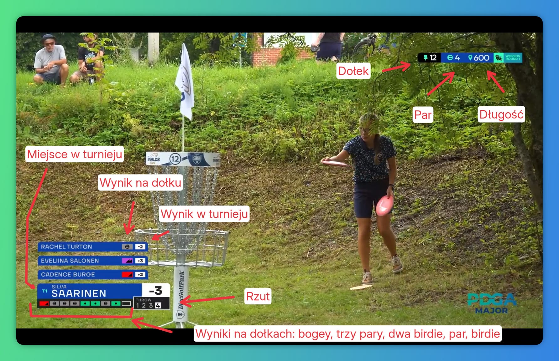 Zrzut ekranu z transmisji disc golfa z elementami interfejsu oznaczonymi strzałkami i napisami wyjaśniającymi znaczenie. Akurat rzuca Silva Saarinen, stojąca niedaleko kosza, z twarzą częściowo zasłoniętą zwisającymi gałęziami.