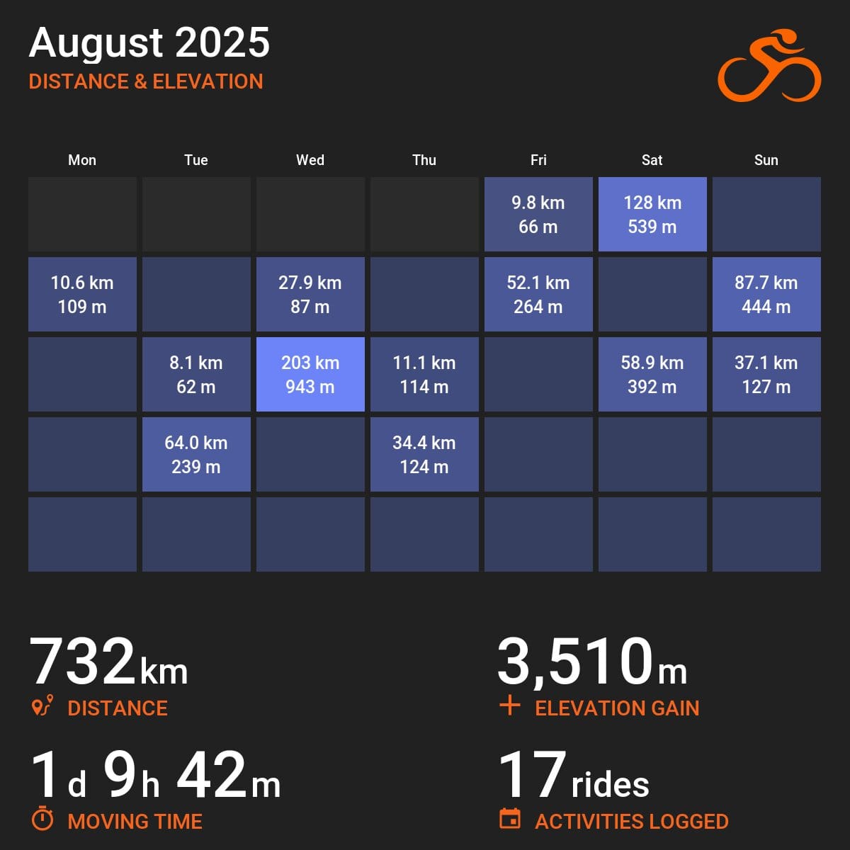 Mimo przedwczesnego zakończenia wyprzedziłem zeszłoroczny sierpień o niecałe 60 kilometrów, zwiększając przewagę nad dystansem z 2024 do 410 km. Przekroczyłem pięć tysięcy przerowerowane w tym roku i mam nadzieję, że w czasie jutrzejszej wizyty u lekarza okaże się, że to jeszcze nie koniec tego sezonu.