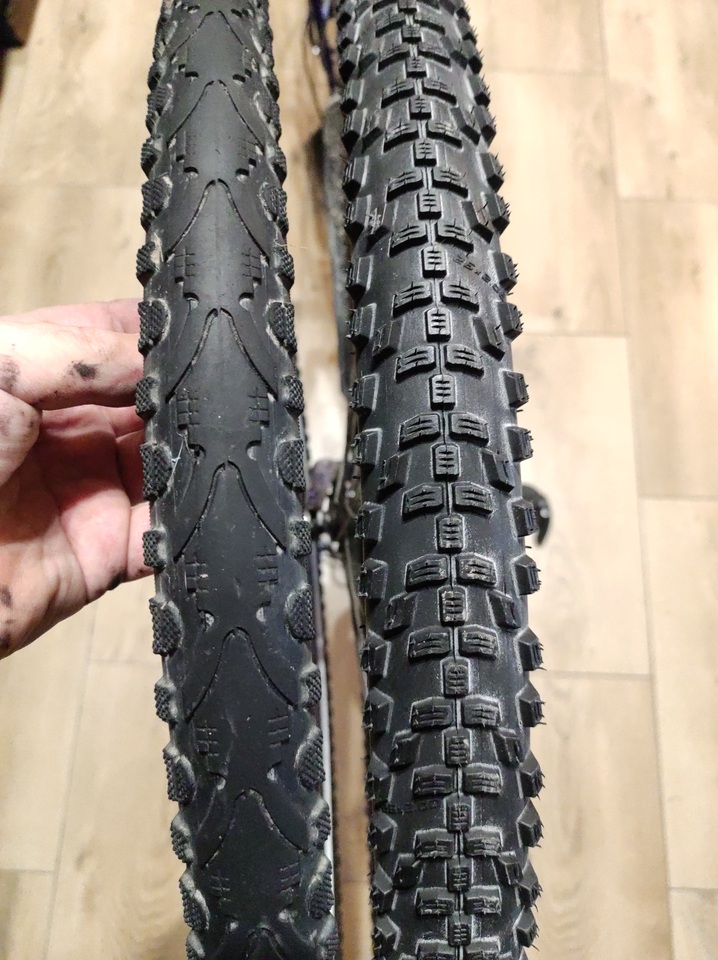 Buty to nie jedyne zakupy, które zrobiłem w tamtym czasie. W tej samej przesyłce przyjechały nowe opony do mojego Treka, trzydziestoletniego roweru trekkingowego, którego używam do jeżdżenia na zakupy w Miasteczku Obok. Na co dzień mam tam założone opony semi-slick Kenda Khan 1,75″. Spisują się nieźle, gdy poruszam się głównie po suchym asfalcie i ubitych gruntówkach oraz szutrach.