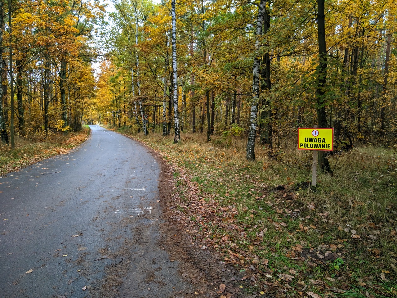 Niezbyt szeroka asfaltowa droga przez mieszany las. Po prawej jej stronie, obok brzóz z żółtymi liśćmi stoi jaskrawa żółta tablica z czerwonym obramowaniem. Na tablicy wykrzyknik w kole a pod nim duży czarny napis „Uwaga polowanie”.