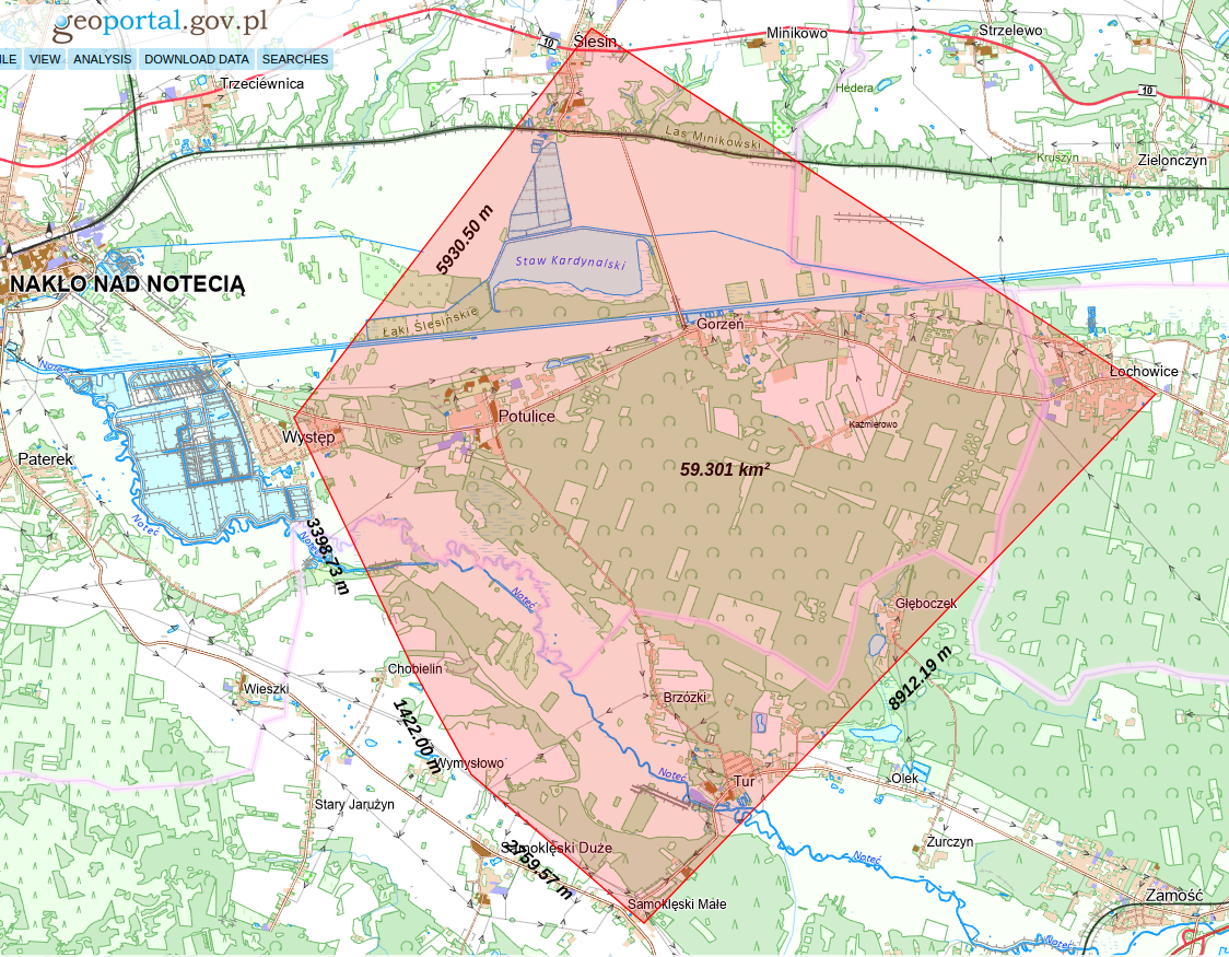 Fragment mapy okolic na południowy wschód od Nakła nad Notecią z zaznaczonym na czerwono obszarem polowania o wielkości 59.301 km²