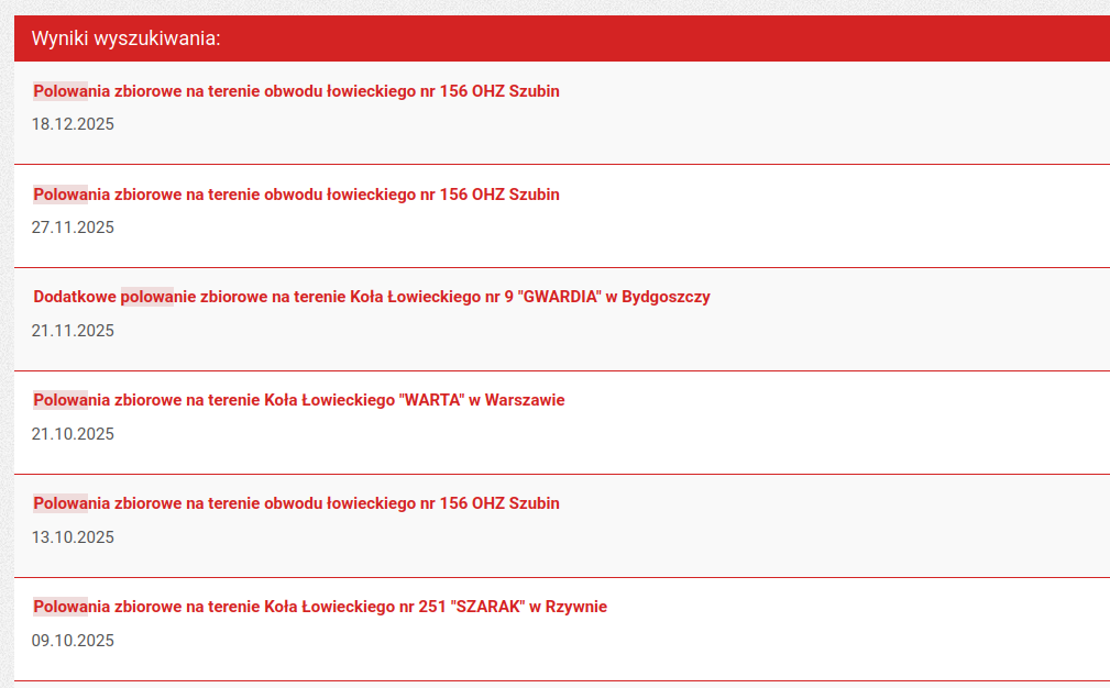 Wyniki wyszukiwania „polowan” w BIP-ie gminy Szubin. Na liście polowania OZH Szubin oraz kół z Bydgoszczy, Warszawy, Szubina i Rzywna.