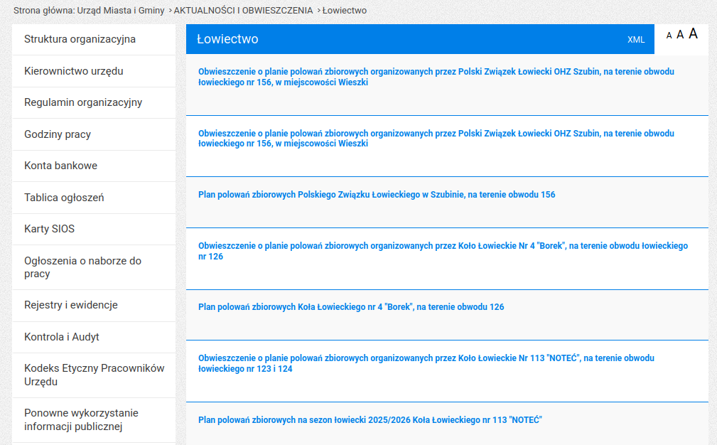 W Biuletynie Informacji Publicznej mojej gminy, czyli Nakła nad Notecią jest specjalna sekcja, do której można się doklikać poprzez Urząd Miasta i Gminy -> Aktualności i obwieszczenia -> Łowiectwo. To niestety nie ułatwia za dużo, bo na stronie znajduje się długa lista pozycji, często niemówiących nic konkretnego, np. „Plan polowań zbiorowych Koła Łowieckiego nr 4 “Borek”, na terenie obwodu 126” lub „Plan polowań zbiorowych Polskiego Związku Łowieckiego w Szubinie, na terenie obwodu 156”.