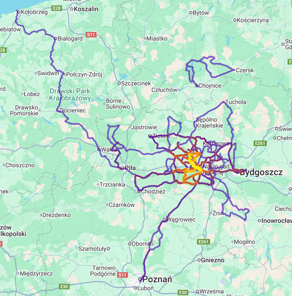 - Najdłuższa trasa: ponad 220 kilometrów do Poznania na ramen i podziwianie tamtejszej infrastruktury rowerowej w czerwcu.