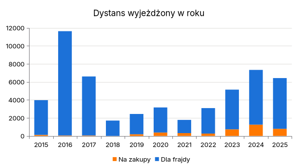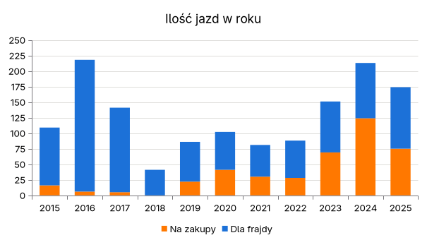 Pod względem ilości jazd miniony rok uplasował się na trzecim miejscu (po 2016 i 2024). Tym razem nie podskoczyłem wyżej dzięki wyjazdom na zakupy, bo po ich odliczeniu okazuje się, że licząc wyłącznie jazdy dla frajdy, 2025 nadal łapie się na podium (po 2016 i 2017).