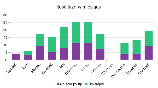 W przeciwieństwie do zeszłego roku, gdy większość zarejestrowanych przejazdów była wyjazdami na zakupy itp., w tym roku większość to jazdy dla frajdy. Ich stosunek to 75 do 99. Różnica między dystansami jest jeszcze większa, 786 kilometrów na zakupy, 5635 dla frajdy.