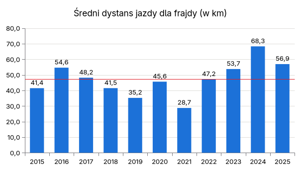 Średnia prędkość jazd dla frajdy tym razem lekko opadła (z 21,8 km/h w 2024 do 21,3 km/h), zamiast nadrabiać straty do rekordowych lat z początków mojego rowerowania, gdy sięgała nawet 27 km/h. Wiek i kontuzje robią swoje i już jakiś czas temu pogodziłem się z tym, że „lepiej już było”.