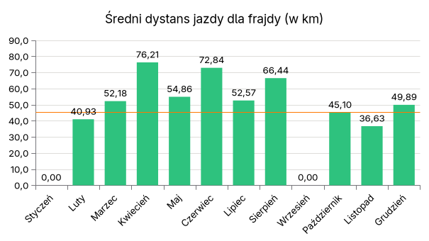 Średnią długość jazdy miałem wyraźnie krótszą niż rok wcześniej, gdy w 9 miesiącach przekraczała 60 kilometrów. Tym razem miałem tylko trzy takie miesiące (kwiecień, czerwiec i sierpień), a w trzech kolejnych średnia była wyższa niż 50 km (marzec, maj i lipiec).