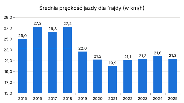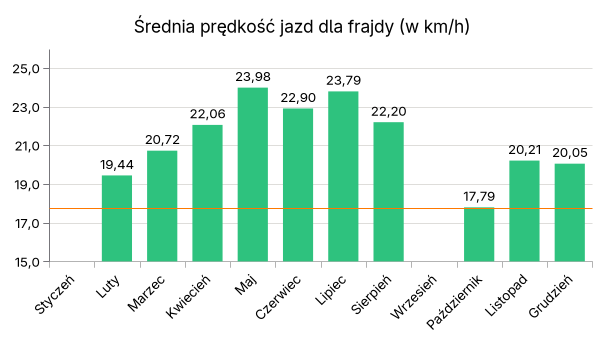 Moje średnie tempo jazd dla frajdy w tym roku nieźle skakało. Zaczęło się poniżej 20 km/h, stopniowo rosło, by w maju i czerwcu zbliżyć się do 24 km/h (wyżej niż w najlepszym miesiącu 2024), a potem ostro spadło do niecałych 18 km/h w październiku, gdy ostrożnie wracałem na rower, po czym odrobinę podskoczyło do okolic 20 km/h.