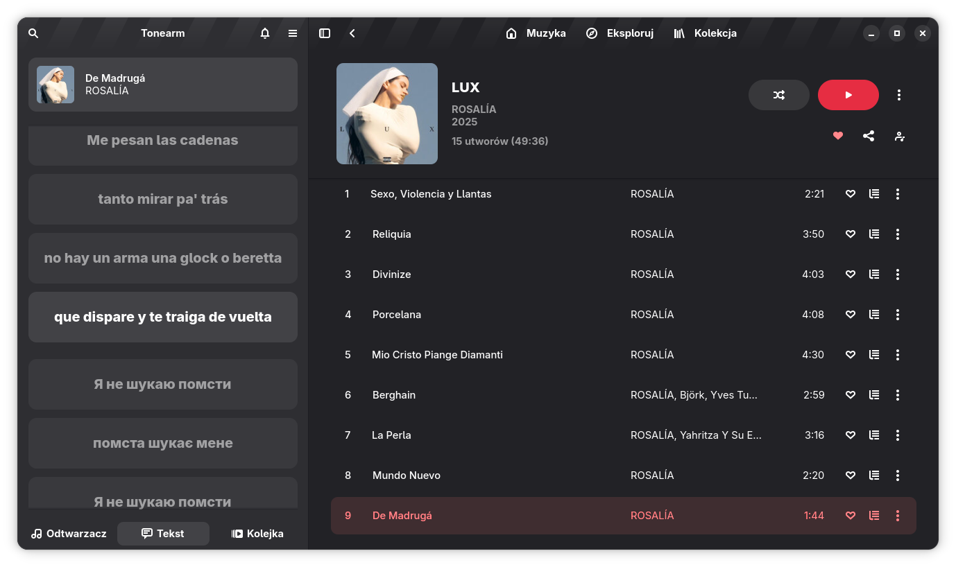 Tonearm pozwala też na wyświetlenie tekstu utworu (o ile jest dostępny) i zarządzaniem kolejką odtwarzania. Obie funkcjonalności są dostępne przez przyciski na spodzie panelu, w którym znajduje się odtwarzacz.