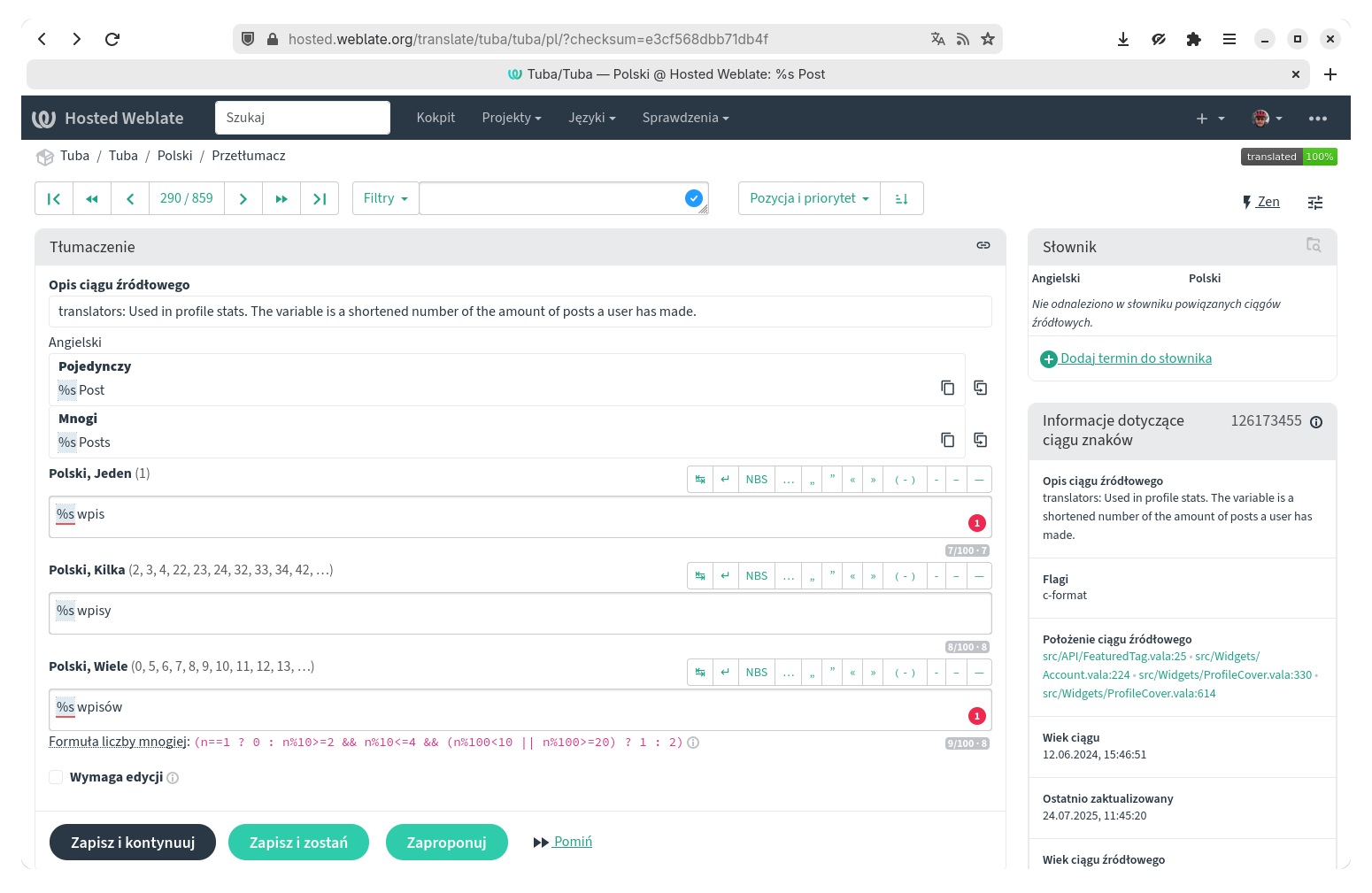 Pod opisem mamy oryginalną wiadomość. Tu wybrałem dla was rzecz trochę rzadszą, bo mamy do czynienia z rzeczownikiem z liczbą pojedynczą i mnogą. Jak widzicie, w angielskim to są dwa pola, u nas już trzy, ponieważ „posts” będziemy tłumaczyć inaczej w zależności od tego, czy to są „trzy wpisy”, czy „pięć wpisów”. Czerwone magiczne zaklęcie pod polami na tłumaczenie to formuła definiująca, dla jakich liczb występują odmienne formy liczby mnogiej.