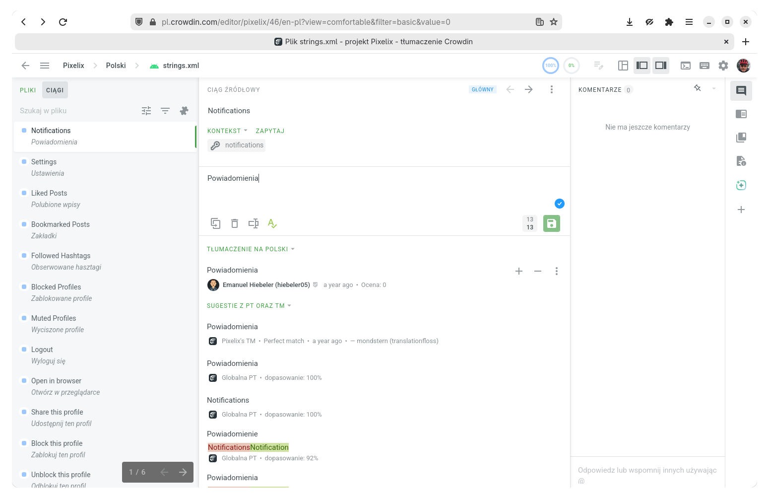 Muszę przyznać, że nie jestem fanem Crowdin i jego interfejs uważam za mniej wygodny niż Weblate. Jak widać na zrzucie powyżej, bardzo różni się od tego drugiego serwisu, ale po przyjrzeniu się rozpoznacie podobne elementy. Lewa strona to przeglądarka ciągów (można przełączyć ją na przeglądanie plików) z opcjami ich filtrowania i sortowania.