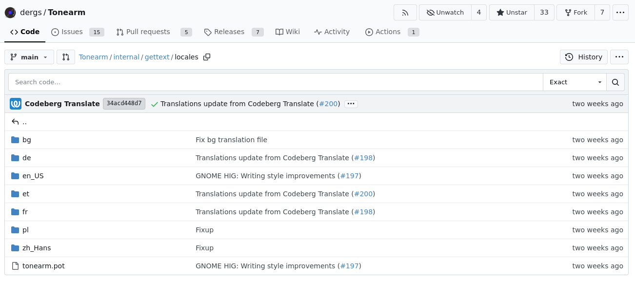 Repozytorium Tonearm w widocznym katalogiem z plikami tłumaczeń.