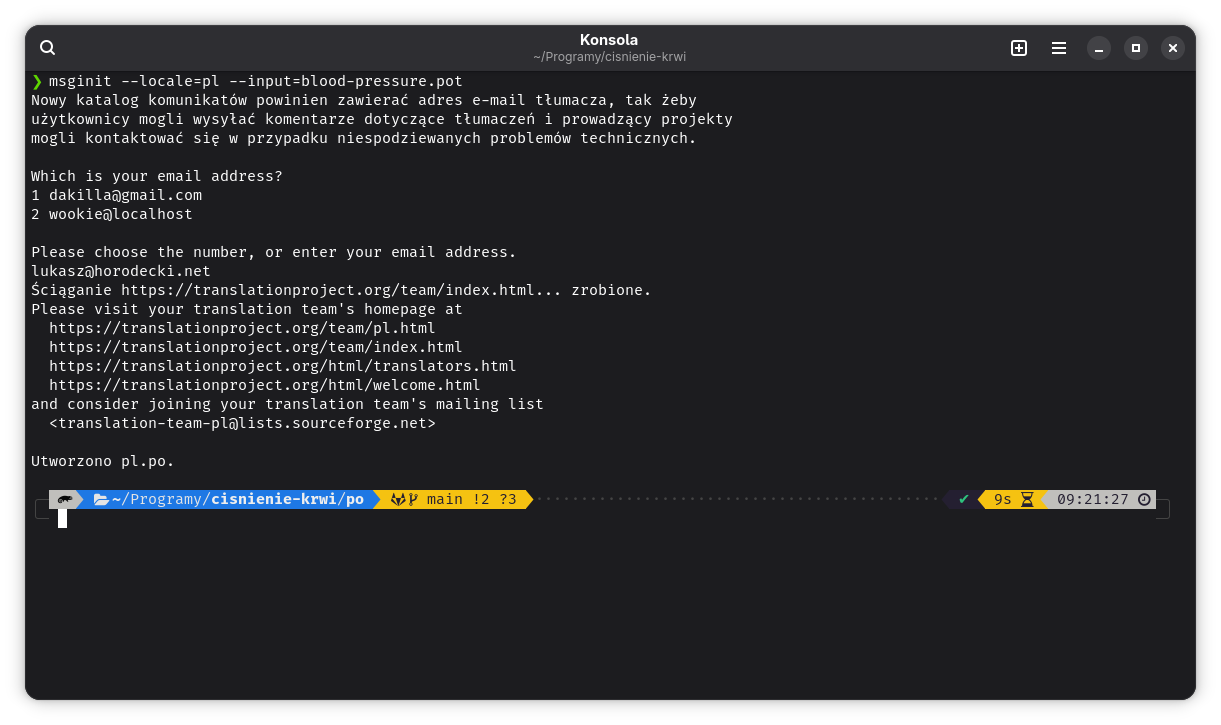 Po jej uruchomieniu zostaniemy zapytanie o adres e-mail, który ma być podany w pliku jako adres tłumacza. Po wpisaniu adresu i zatwierdzeniu powinien powstać plik pl.po, w którym będziemy wpisywali polskie tłumaczenie. Zanim się za to zabierzecie, warto najpierw otworzyć plik LINGUAS i dopisać pl w osobnym wierszu tak, żeby zachować alfabetyczną kolejność wpisów.