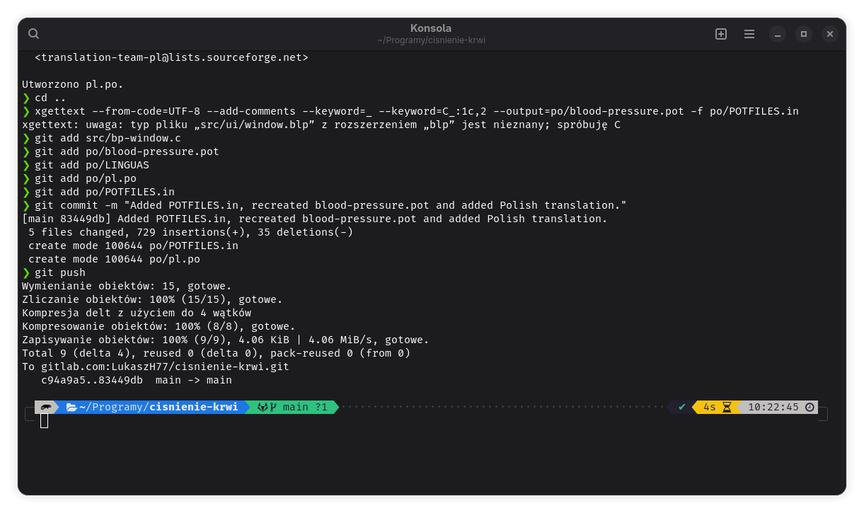 Po przygotowaniu tłumaczenia trzeba je wrzucić do naszego repo. Jako że sklonowałem repozytorium przy użyciu git clone, to teraz mogę załatwić to wygodnie w terminalu. Najpierw przy pomocy git add dodaję po kolei pliki (całość zmian można od razu dodać komendą git add .), które utworzyłem lub zmodyfikowałem, a potem poleceniem git commit -m "Opis zmian" tworzę zatwierdzenie. Na koniec zostaje użycie git push do wypchnięcia zmian do zdalnego repozytorium na GitLabie.