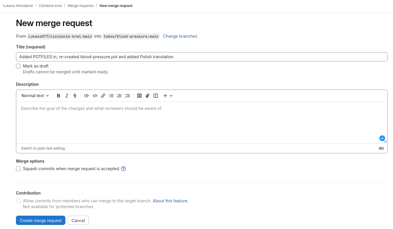 Ostatni krok to wysłanie zmian do oryginalnego repozytorium programu. Na stronie mojego forka klikam „Create merge request” i w formularzu, który się wyświetli mogę opisać na czym polegają zmiany.