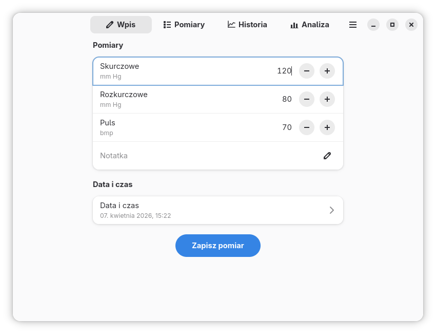 Okno programu Blood Pressure z aktywną zakładką „Wpis”. Pola formularza to: Skurczowe, Rozkurczowe, Puls, Notatka oraz Data i czas.
