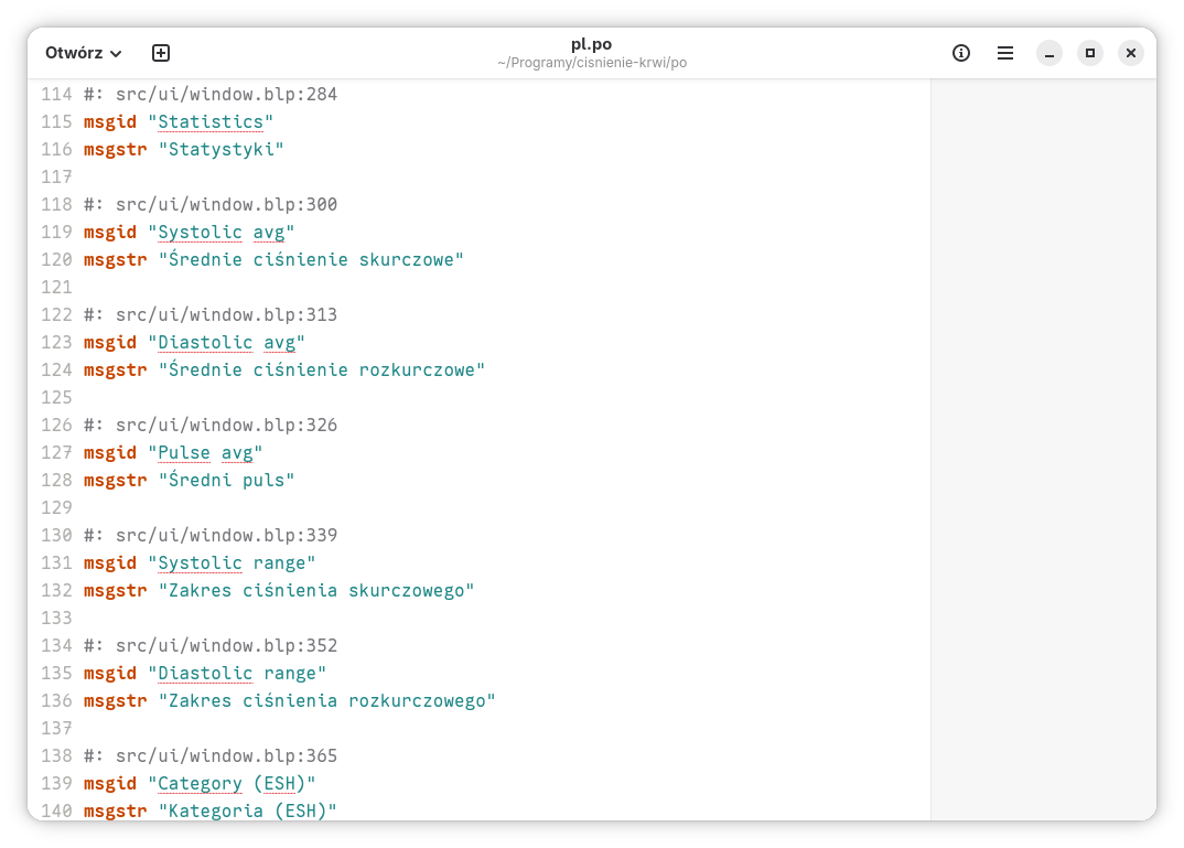 Okno edytora tekstu z otworzonym plikiem pl.po zawierającym tłumaczenie programu Blood Pressure.