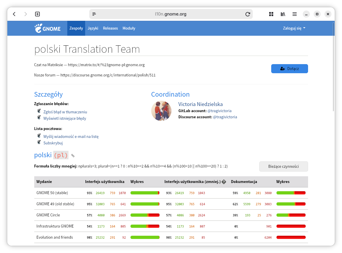 Następnym krokiem jest dołączenie do polskiego zespołu. Zespół jest w trakcie reorganizacji, która nałożyła się na natłok pracy przy wydaniu GNOME 50, ale nowa koordynatorka to osoba bardzo dynamiczna i sprawy idą w dobrą stronę. Dorobiliśmy się już forum na oficjalnym Discourse GNOME oraz kanału Matrix, który jest najlepszym sposobem na komunikację z resztą zespołu i zadawanie pytań związanych z tłumaczeniem.
