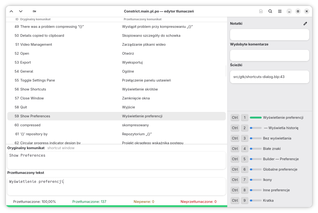 Polecam zapoznanie się ze skrótami klawiszowymi (np. Alt + -> to następny komunikat, a Alt + Page Down przechodzi do następnej nieprzetłumaczonej wiadomości), dzięki którym poruszanie się po pliku jest szybkie i wygodne.