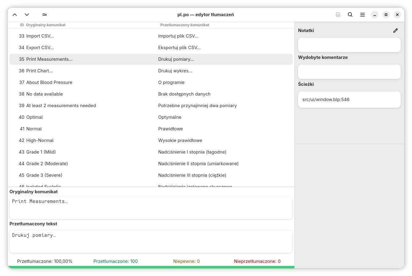Jak wygląda przebieg tłumaczenia pokażę na przykładzie Blood Pressure, aplikacji, którą znalazłem niedawno na Flathub.org, po tym, jak lekarz kazał mi przez tydzień mierzyć ciśnienie i zapisywać wyniki.